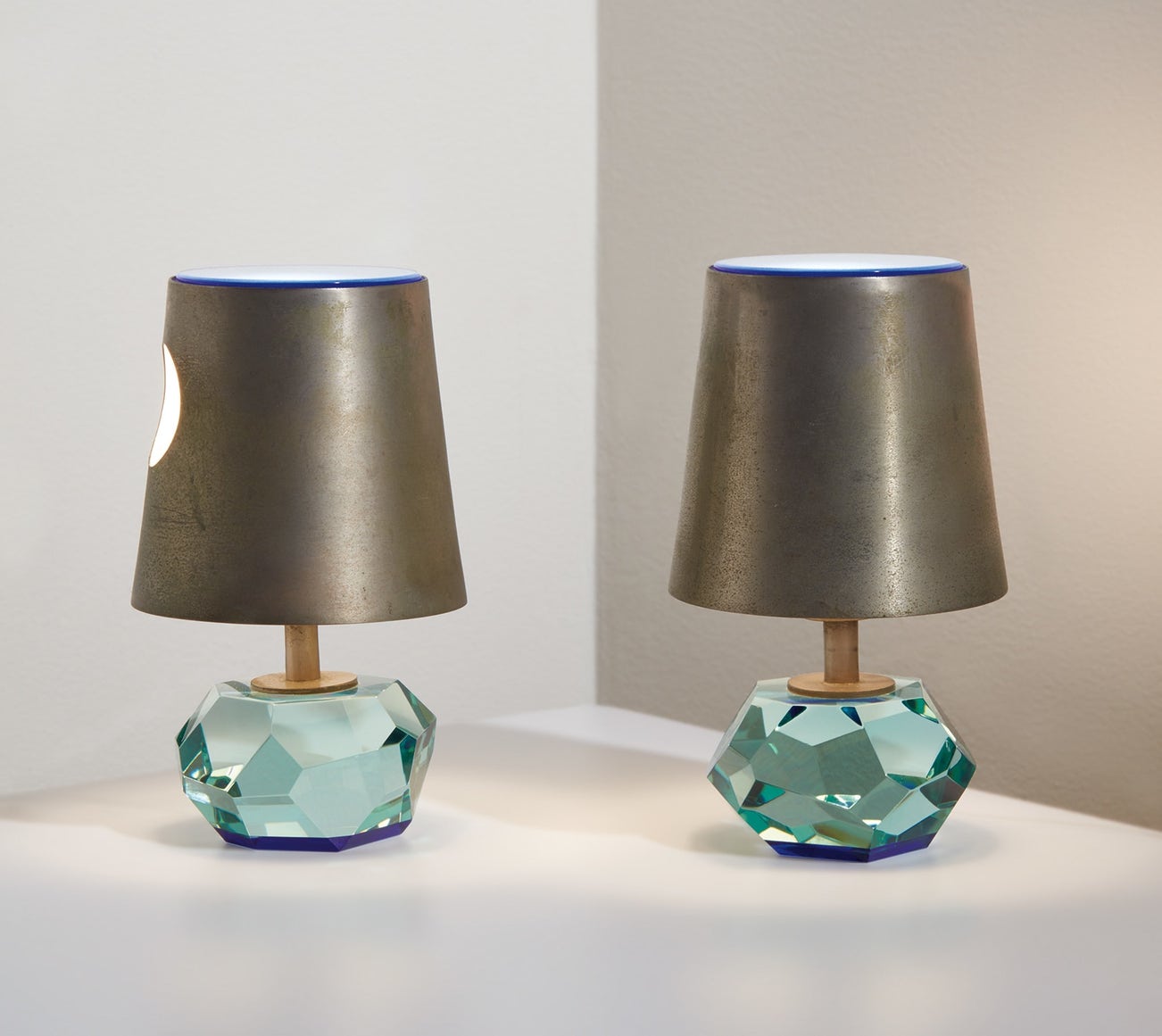 Crystal-cut glass, colored glass, nickel-plated brass.