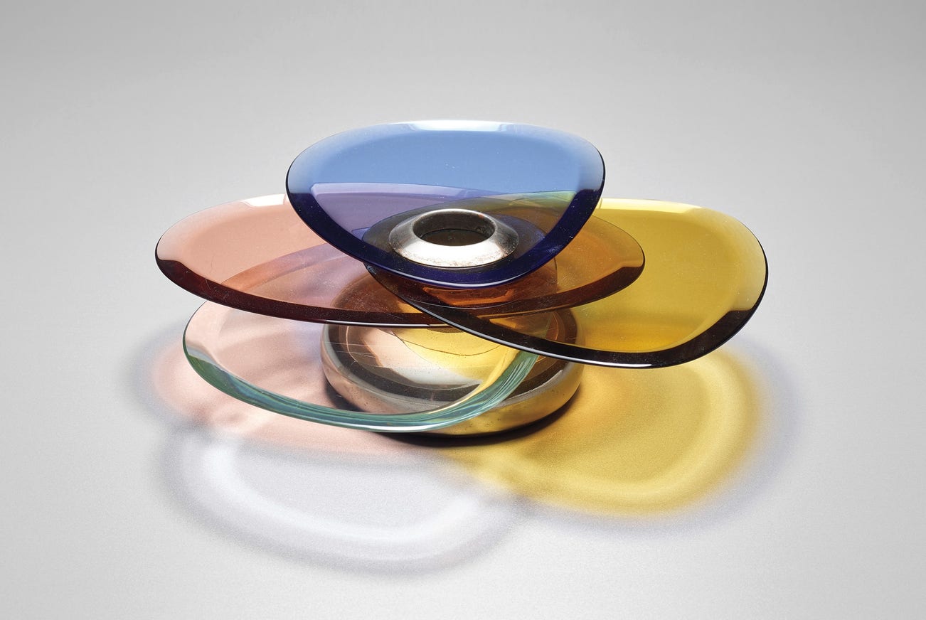 Coloured glass, glass, nickel-plated brass.