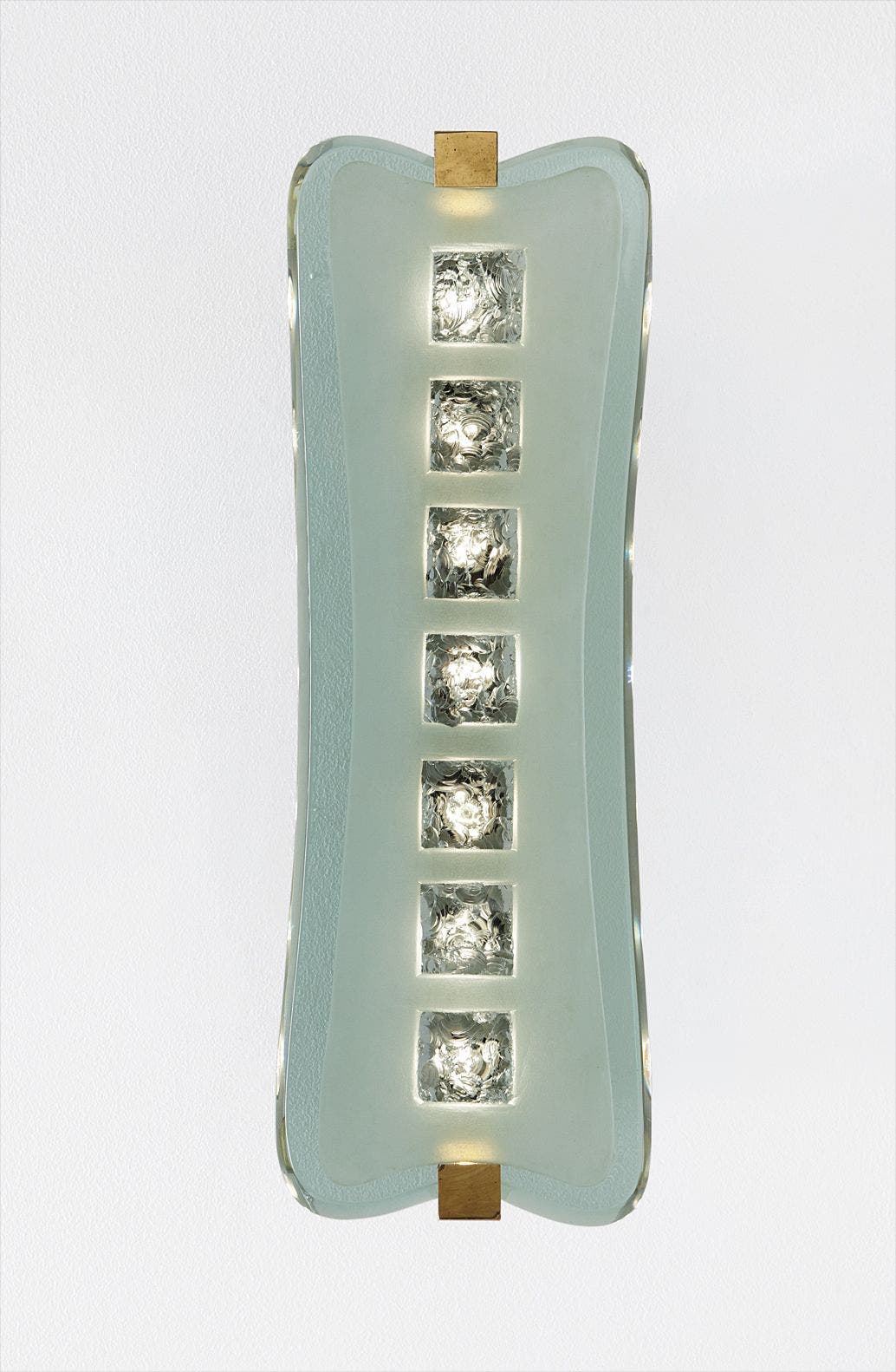 Frosted and partially-chiseled glass, nickel-plated and polished bronze, steel.
