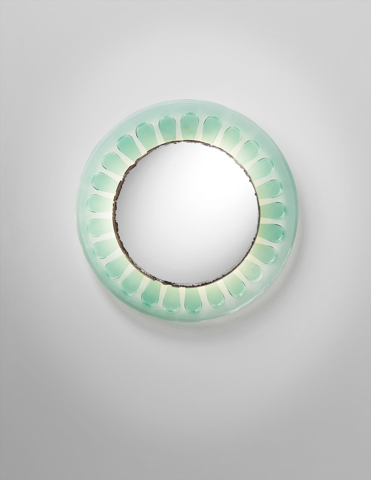 Mirrored glass, coloured glass, painted metal.