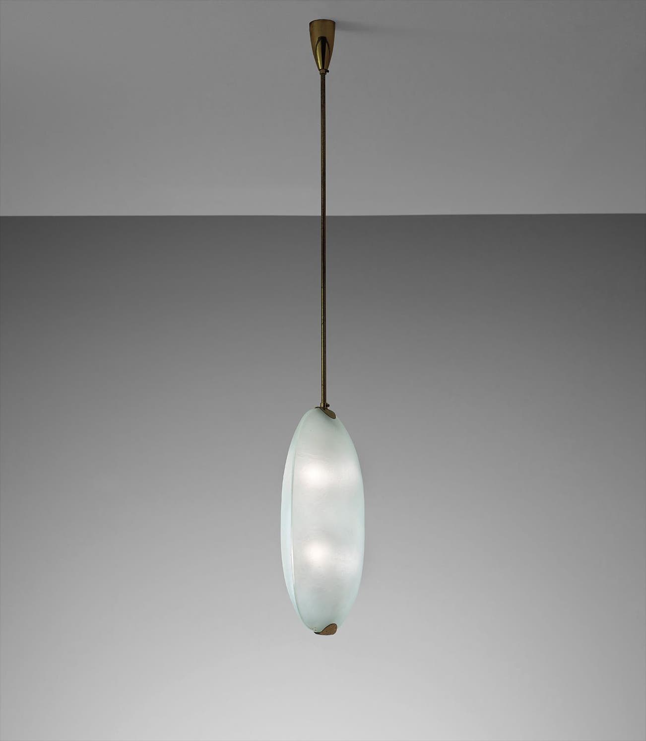 Frosted glass, tubular brass, brass, painted brass.