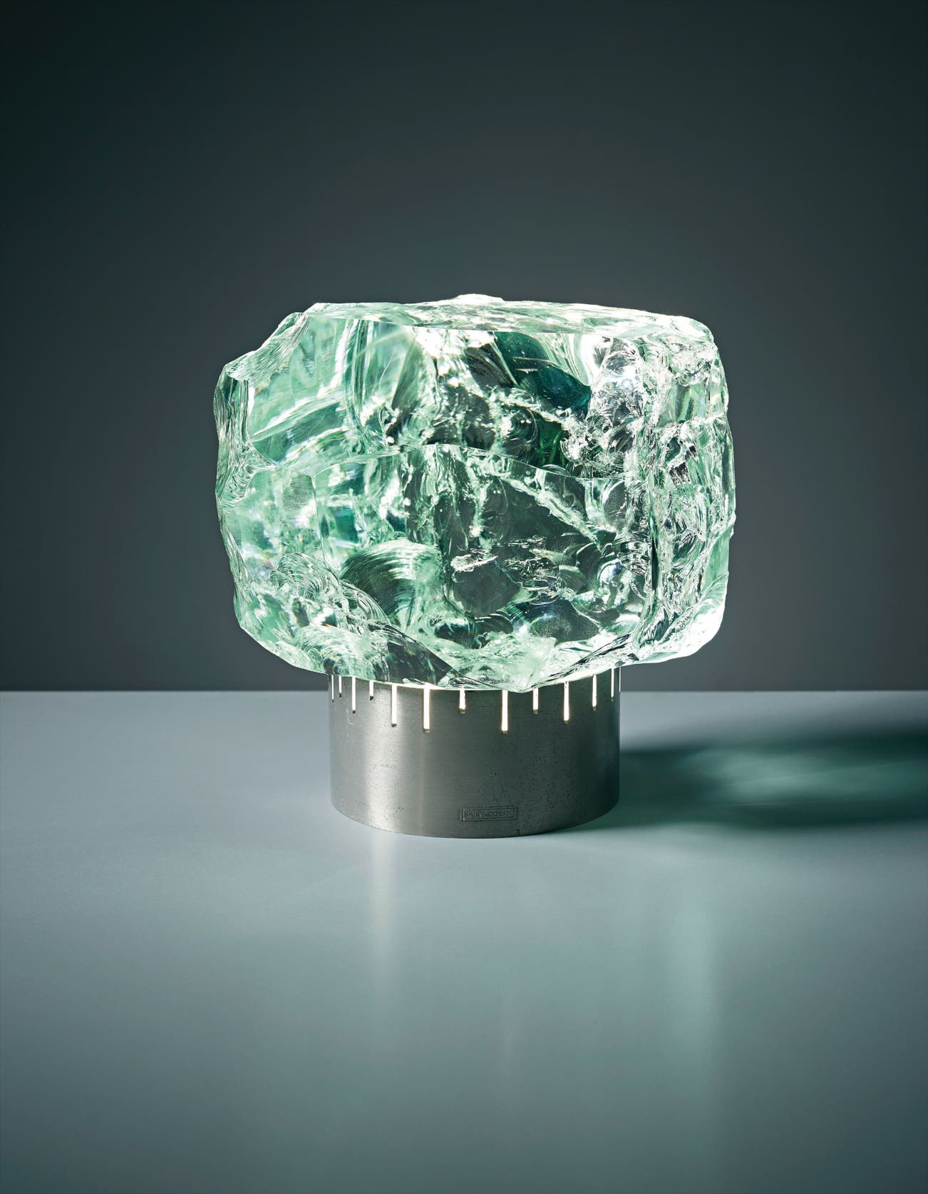 Nickel-plated brass, chiselled glass.