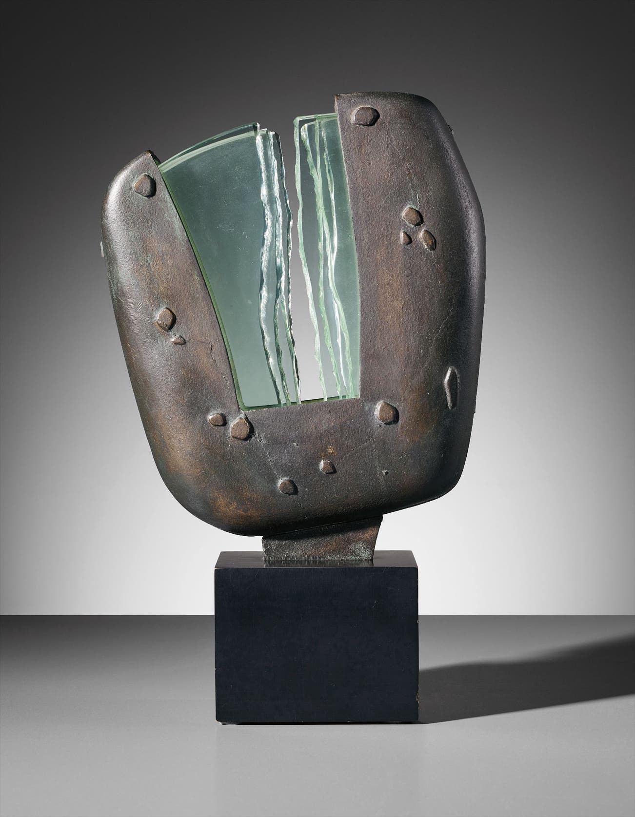 Patinated bronze, glass, painted wood.