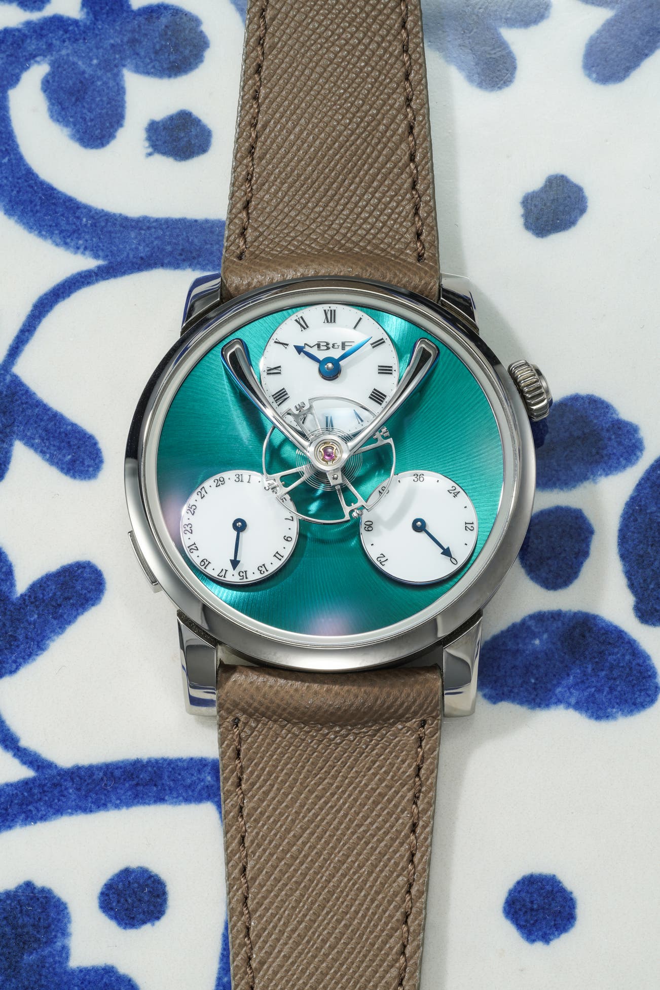 - Matching the technical brilliance within, the teal dial is crafted using PECVD (plasma-enhanced chemical vapor deposition), which creates an iridescent, shimmering surface with subtle texture. The result is a vivid, almost liquid display of color and depth—a futuristic finish for one of MB&F’s most technically ambitious.