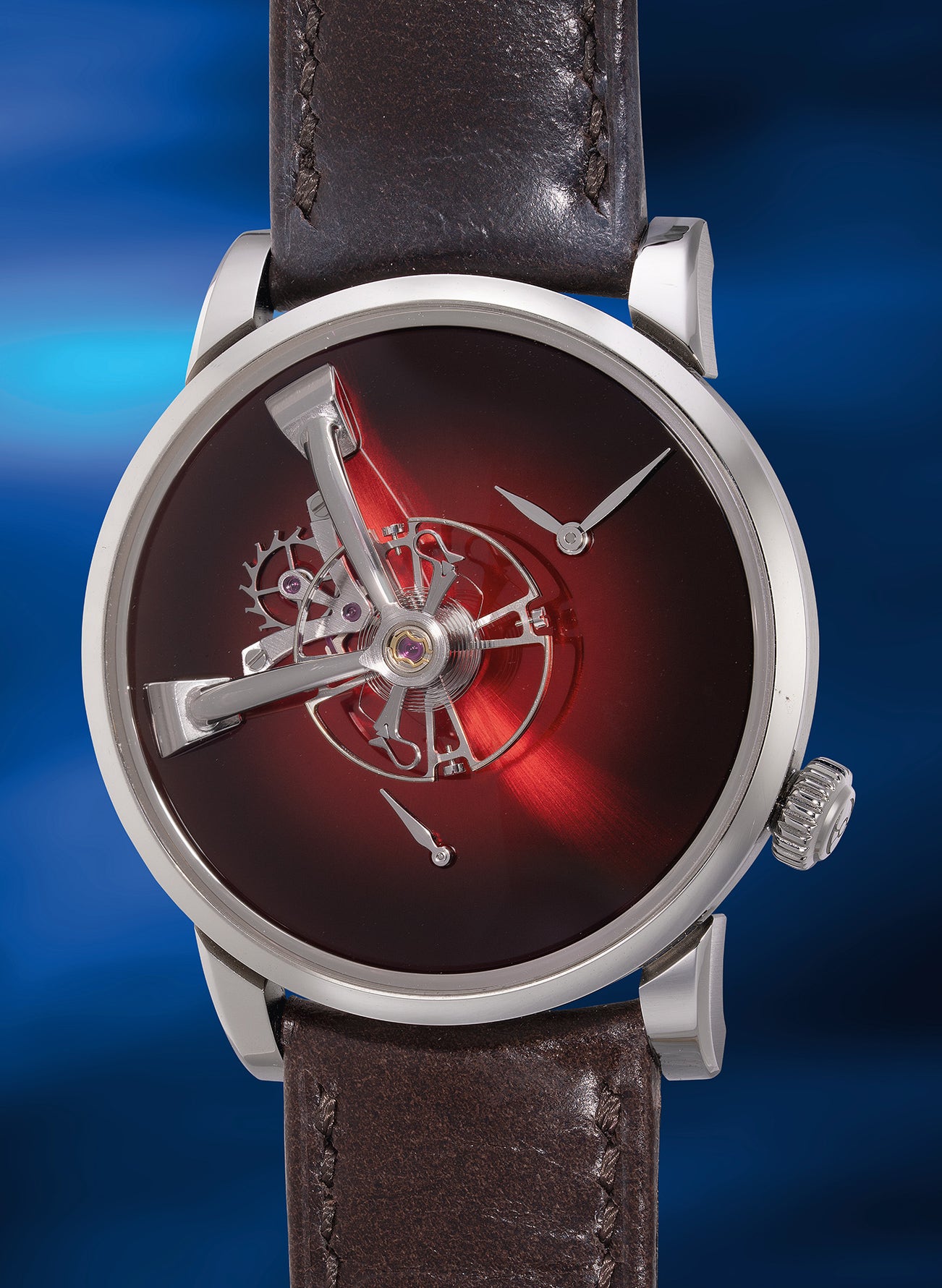 The present watch is extremely rare and is numbered 8 of only 15 pieces with the red fumé dials (other dial options include funky blue, cosmic green and aqua blue, each produced in a limited edition of only 15 pieces). It is preserved in “like-new” condition, from the original owner and accompanied by full set of accessories, including an incredibly cool presentation box.