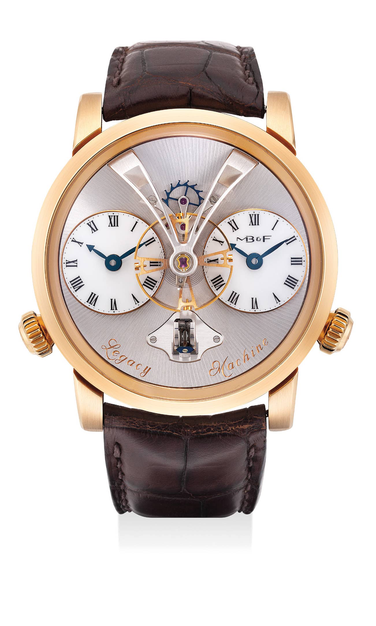 The Legacy Machine is a dual-time wristwatch that changes the overall aesthetic of traditional horology most prominently with the oversized balance wheel front and center on the dial and a three dimensional power indicator that rises from the dial at the 6 o’clock position, which Busser himself said was based on the sextant. The single mainspring powers the two independent dials, each having its own setting crown with only the right side crown for winding the watch. The watch was produced in 18k pink gold and white gold, as well as a limited edition of 33 pieces in platinum and a special 13 pieces in titanium for the M.A.D Gallery in Dubai, as well as a series of 18 timepieces in stainless steel.