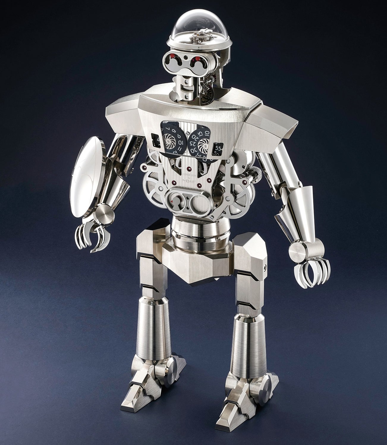 A massive two-sides limited edition palladium-plated polished brass robot table clock with 35 days power reserve, 20-second retrograde displays, moonphases, box and guarantee