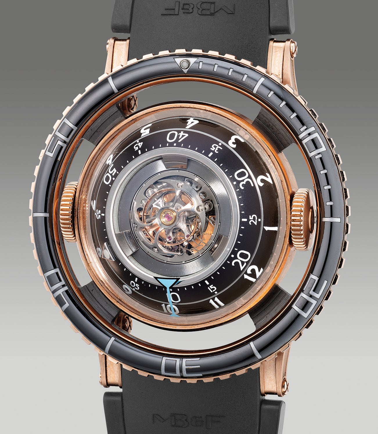 Immediately making its presence known, the oversized case topped with an ultra-high domed sapphire crystal encapsulates the flying tourbillon positioned on the center of the watch. Featuring a ceramic bezel insert suspended by its lugs, the hollowed gap in between at 3 and 9 o’clock features two crowns, the left for winding and the right for time adjusting. While its hours and minutes are indicated via two rotating discs one atop of another, a nice little feature with the looks of a tall “martini glass” indicates the minutes. The numerals and graphics are Superluminova with ambient luminous material featured on the inner-rim of the tourbillon carriage. Once turned over, the excitement continues as it features a tentacle-like winding rotor composed of platinum. Although the horological machine is oversized with a case measuring 53.8mm diameter, it is compensated by articulated lugs that provide a snug fit on the wrist.