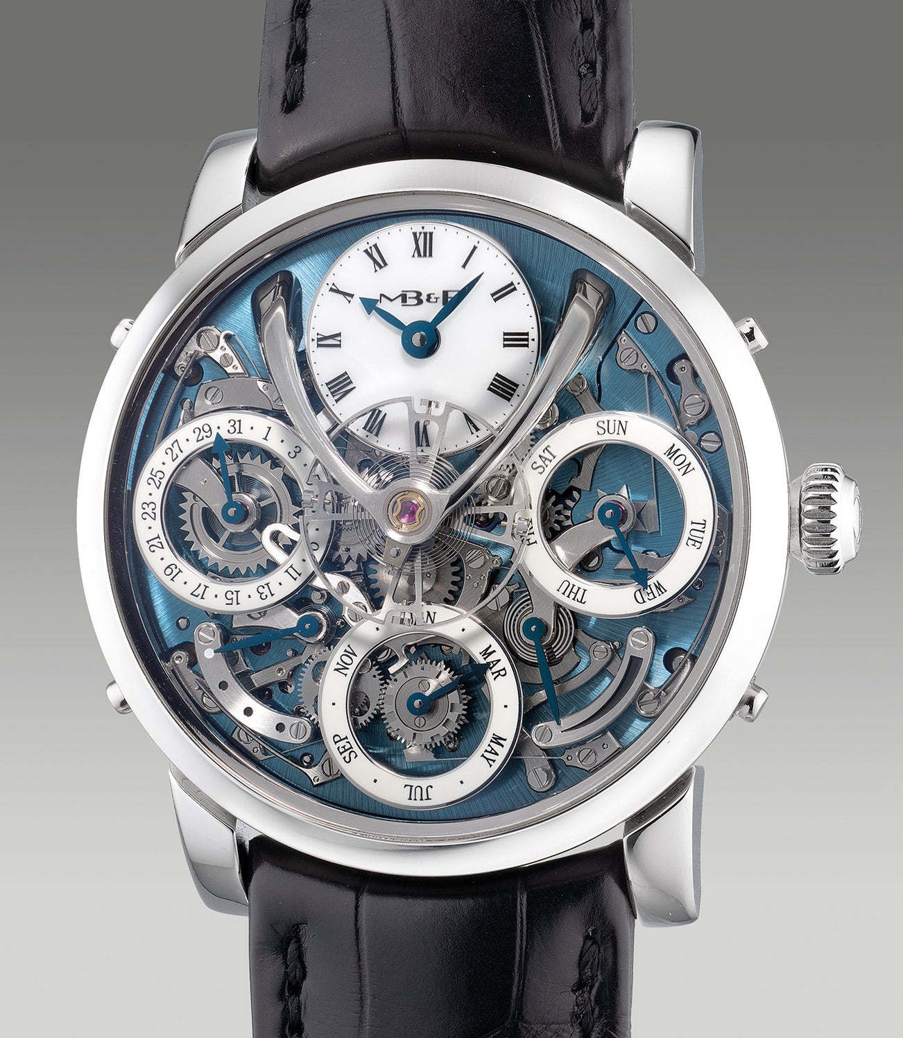 Awarded the Best Calendar Watch in GPHG 2016, the three-dimensional architecture of the model exhibits a revolutionary in-house mechanism featuring 581 components. The mechanical processor uses a default 28-day months—as opposed to the traditional use of 31 days—and adds extra days as required without “skipping over” redundant days, resulting a fool-proof system that auto protects itself from incorrect manipulation. Encased in platinum featuring an electric blue dial and the brand’s signature flying balance suspended above the mechanism and can be fully appreciated under the high-dimed crystal. The back side is also beautifully hand finished with perfectly aligned Geneva waves with interior and exterior polished angles, and finessed with an elegant engraving the watchmaker’s name.