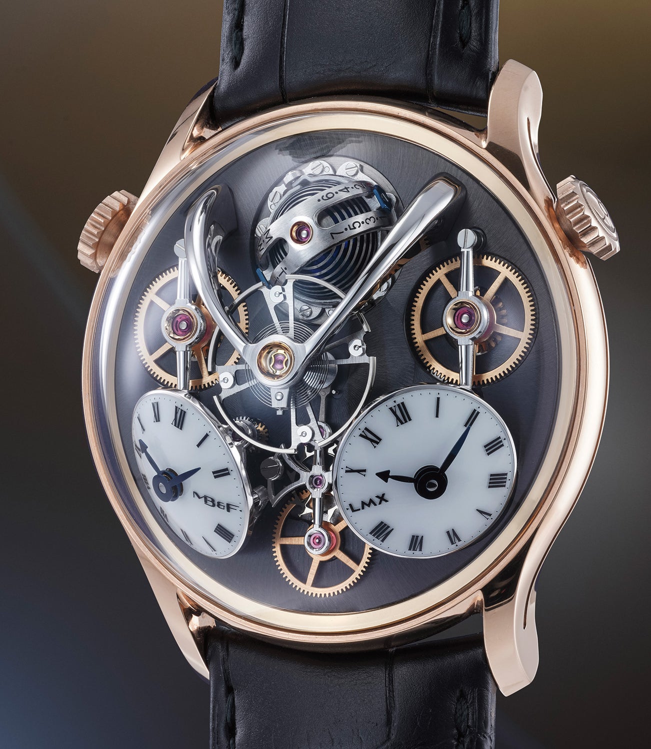 A true gem of horological design and technical prowess the present LMX in pink gold is number 1 of a limited edition of 18 pieces.