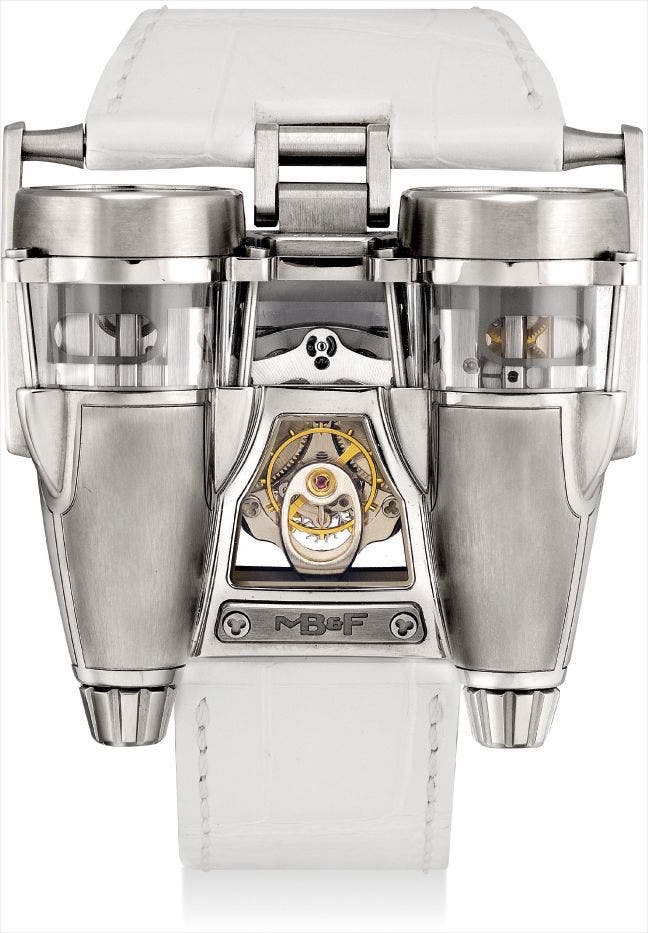 MB&F's Horological Machine line is inspired by fantastical memories, evoking the images and feelings one experiences as a child. The result: machines that tell time, cased in the most unconventional materials such as titanium and ceramic, and sculpted in innovative and futuristic ways. While each machine represents a different "theme", such as a car dashboard or frog, all examples undergo the most rigorous standards in quality.