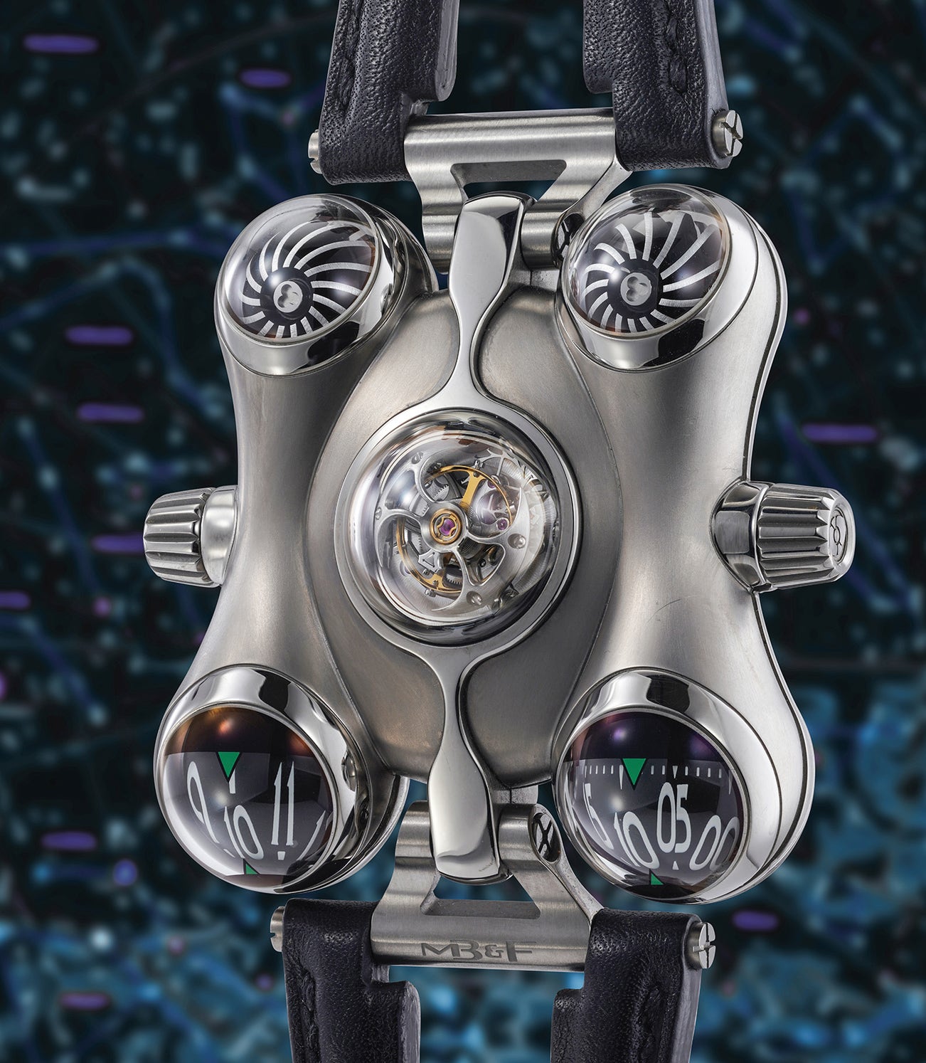 The kinetic sculptures leaving the workshops of Max Busser’s radical horological troupe, otherwise known as MB&F, have come to exemplify audacity, creativity, out-of-the-box thinking and superb craftsmanship. Rarely has the creativity of a brand been so consistent, from the sister entry-level brand M.A.D Editions to the latest Legacy Machine Longhorns and Horological Machine 11. Inspired by the bulbous spaceship of Captain Flam (also known as Captain Futuro), a Japanese cartoon character that was very popular in the 1970s-1980s, the Horological Machine 6 is also nicknamed the Space Pirate. The entire shape and time telling of the watch is like no other, it is a surprising organic spacecraft that fits the wrist perfectly. Time is read via rotating spheres (hours on the left and minutes on the right). The top center features a lovely flying tourbillon that can be shielded or remain visible by turning the crown on the left. Two turbines resembling spacecraft engines are placed on the back and rotate with the movement of the arm. They are, in fact, linked to the winding by a gear train and amplify the number of rotations, thus making the automatic winding more efficient.