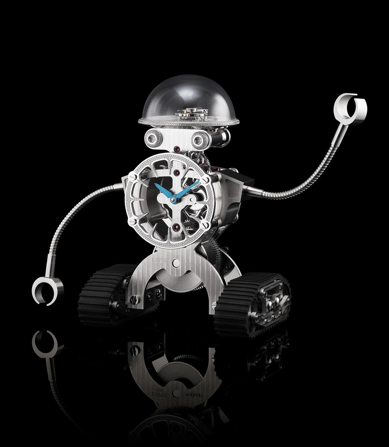 It takes creative genius to manufacture a clock resembling a robot, and MB&F is one of the few modern brands with the desire to push the limits of traditional watchmaking and produce a kinetic sculptural piece, which is both whimsical and practical. Introduced at SIHH in 2016, Sherman was a collaborative effort between MB &F and partner L’Epée 1839. The body is structured using watch parts with movement plates and bridges forming the skeleton and body, the 8-day mainspring barrel extends down and supports rubber-clad caterpillar tracks, while the domed glass head reveals the mechanical brain represented by the regulator and balance wheel. While the design is all MB & F, the engineering design is by L’Epée 1839.