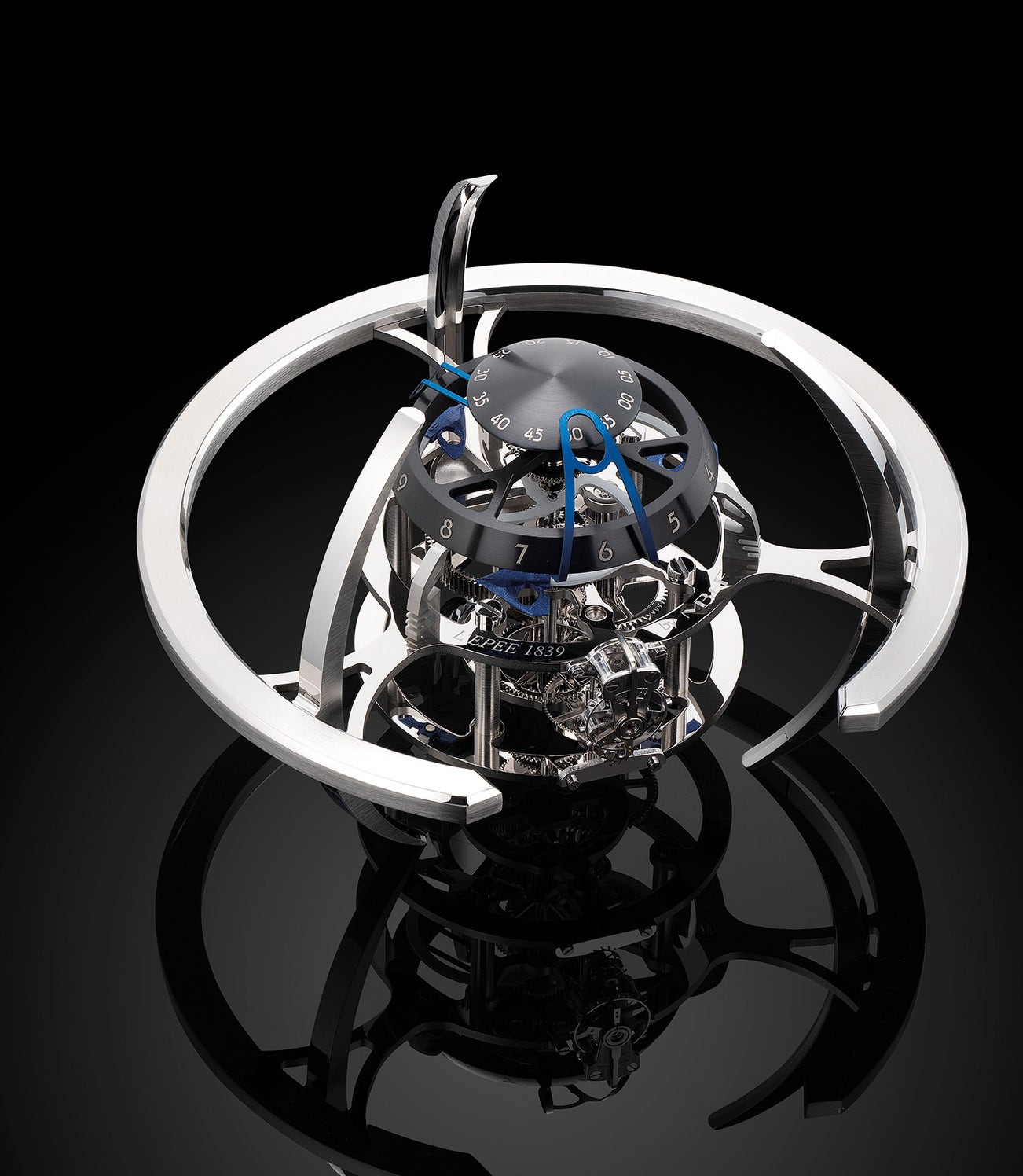A very fine, unusual and impressive limited edition stainless steel and palladium-treated brass skeletonized three-dimensional table clock with blue animated spacecrafts, guarantee and presentation box, limited edition of 99 pieces