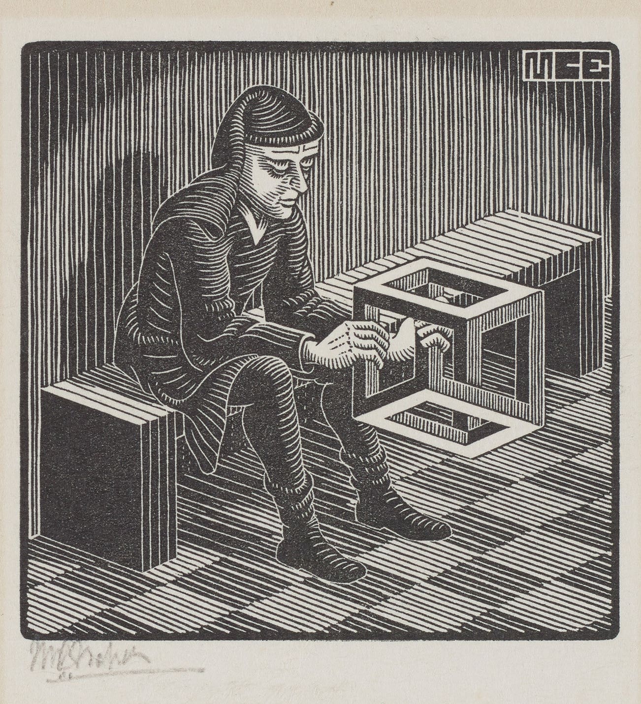 This vignette was printed on the invitation card for the exhibition of Escher’s work at the Insitut Néerlandais in Paris, 12-28 March, 1965