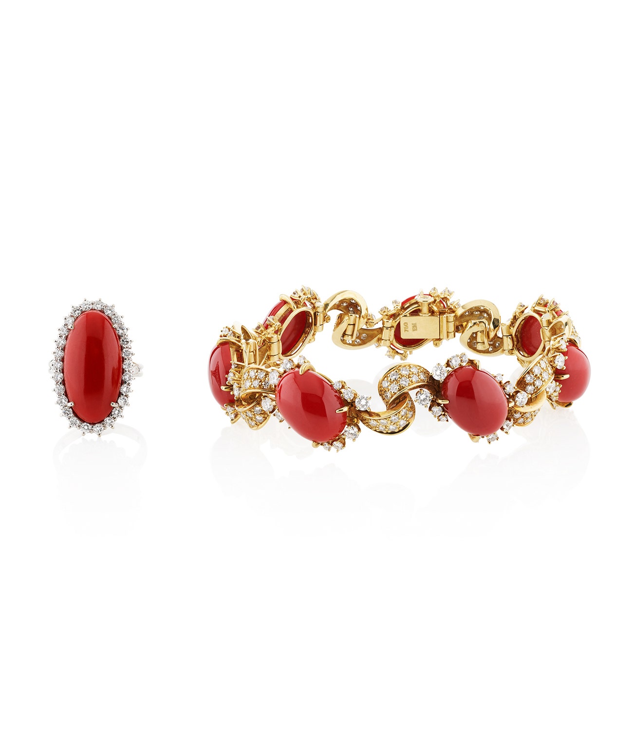 The bracelet set with oval cabochon corals, highlighted with circular-cut diamonds, inner circumference approximately 200mm, maker's mark for Meister, the ring set with an oval cabochon coral, within a frame of circular-cut diamonds, size 56.