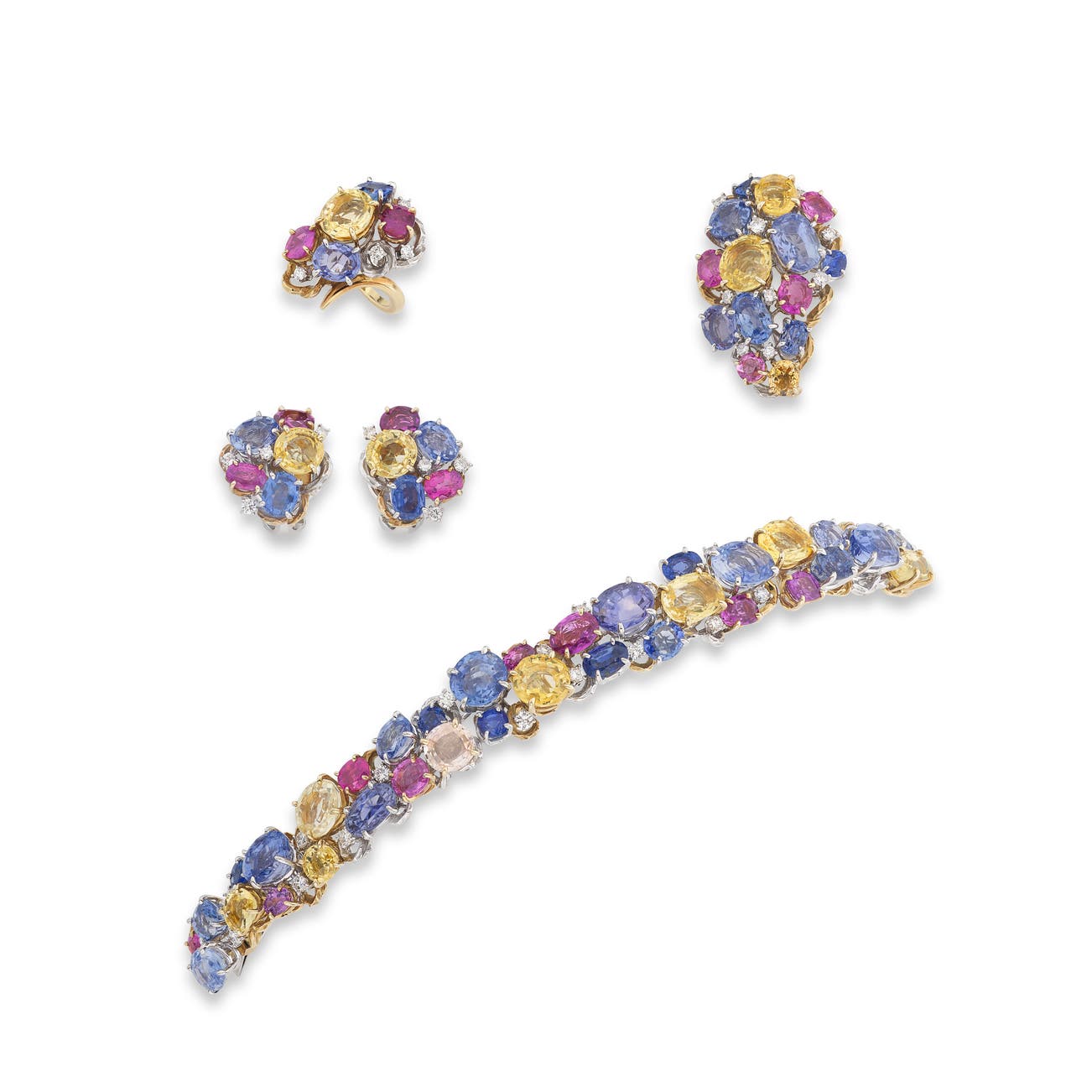 Comprising: a bracelet, set with oval and circular-cut coloured sapphires and sapphires, accented with brilliant-cut diamonds, decorated with textured gold detailing, inner circumference approximately 155mm, signed Meister, a brooch, measuring approximately 45 x 29mm, may be worn as a pendant, a pair of ear clips, each measuring approximately 21 x 20mm, and a ring, size 51½, each with maker's mark for Emil Meister.