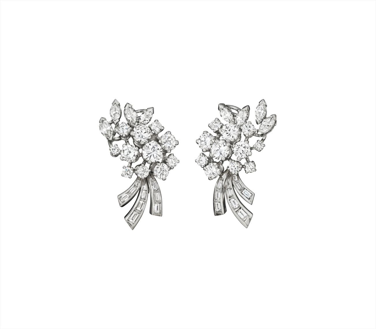 Each centering on a cluster of marquise and circular-cut diamonds, extending a rectangular-cut diamond spray, mounted in 18K white gold, length 1 inch.