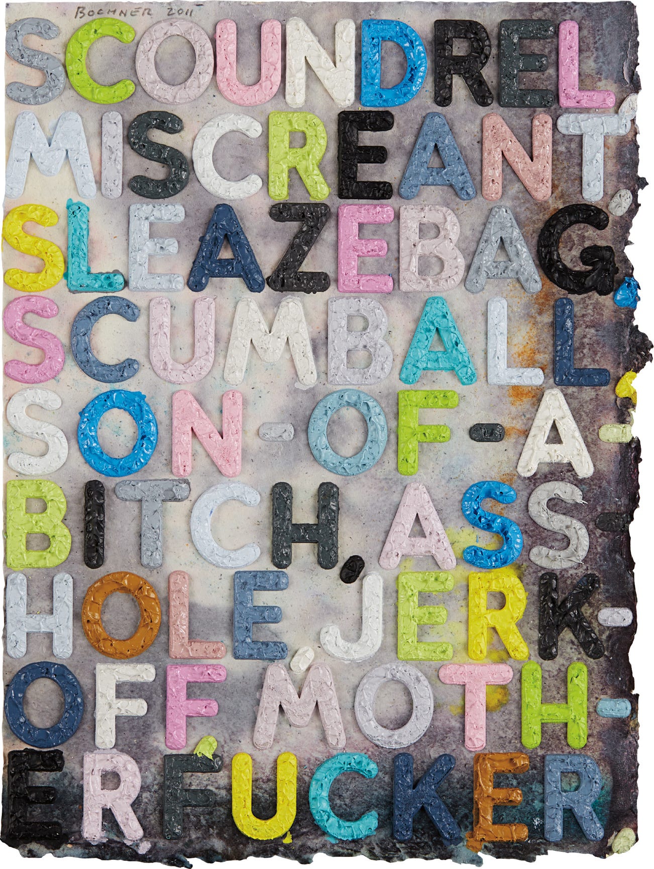 Monoprint with collage, engraving, embossing and oil paint in colours, on handmade and hand-dyed Twinrocker paper, the full sheet.