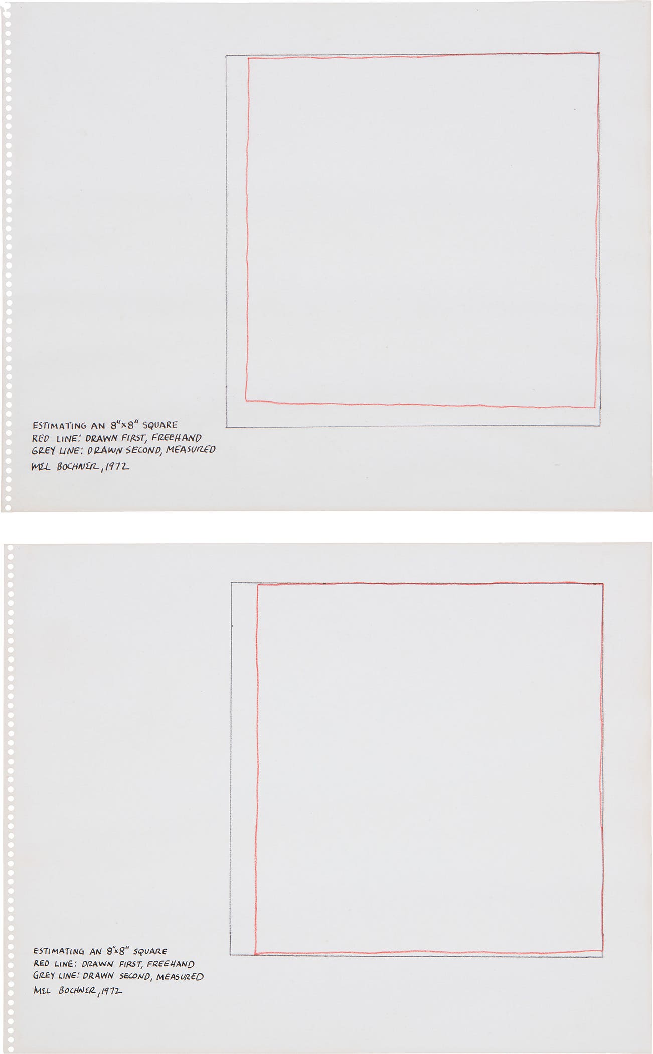 each signed, titled, inscribed and dated "ESTIMATING AN 8" x 8" SQUARE RED LINE: DRAWN FIRST, FREE HAND GREY LINE: DRAWN SECOND, MEASURED MEL BOCHNER, 1972" lower left