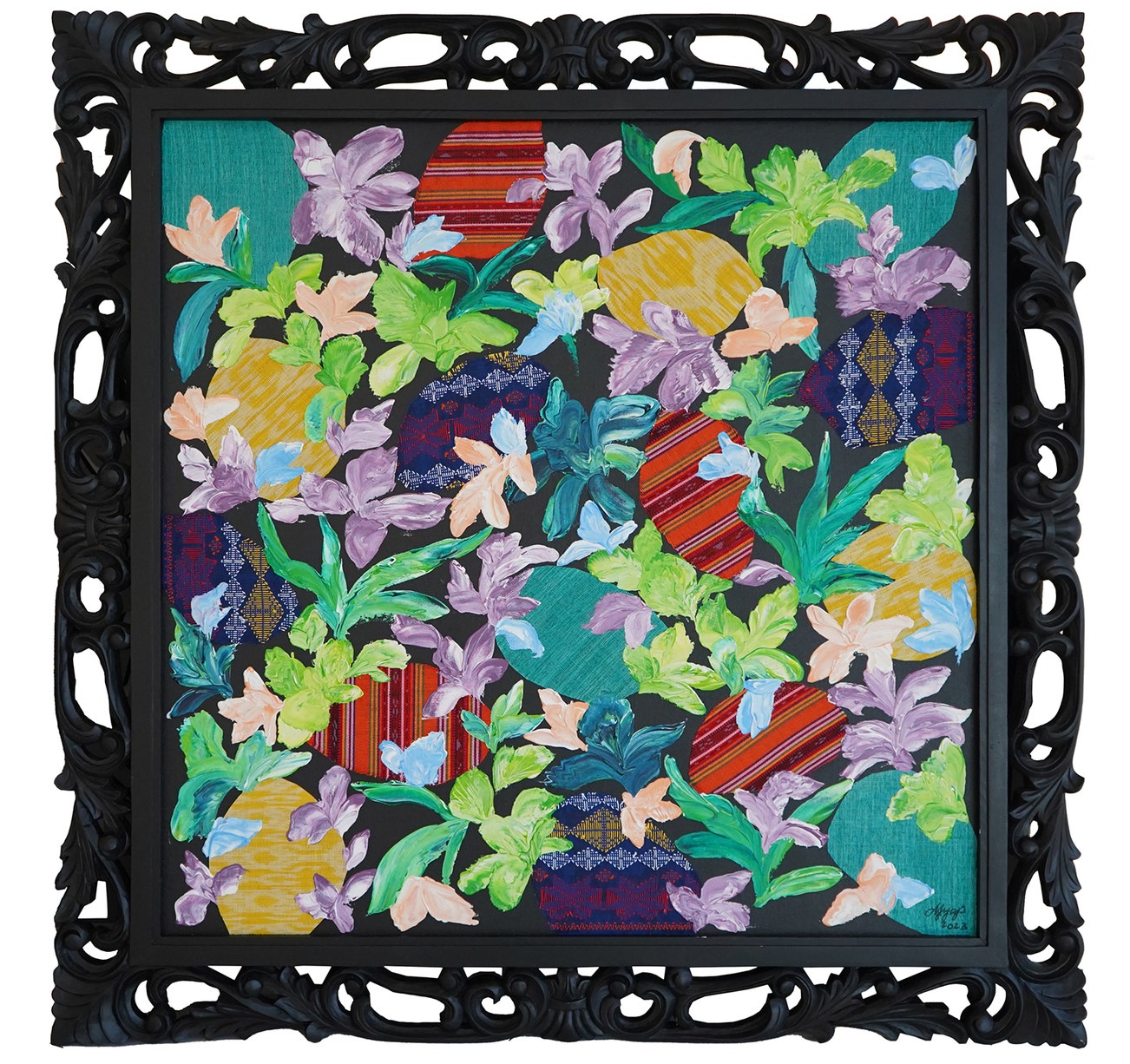 Lush Life is a celebration of the beauty and diversity of Filipino culture, combining bright acrylic paint, handwoven indigenous Philippine fabrics and an intricate hand-carved frame. Melissa Yeung-Yap blends age-old traditional craft with contemporary skills by employing traditional fabrics such as Yakan Tennun, T’boli T'nalak, Manobo weave, and Maranao Balud weave. She also aims to empower the female artisans who created them, stressing the role of these women in the Philippines’ rich cultural heritage. In this sense, Lush Life is the product of not just one female artist, but many.