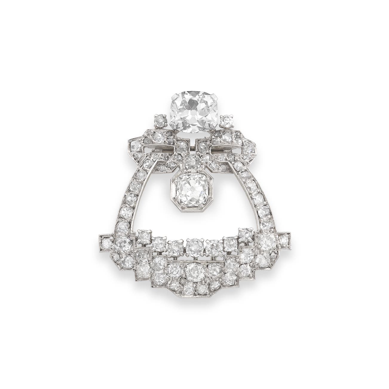 Of openwork design, set with a cushion-shaped diamond weighing 3.01 carats, further highlighted with old-cut diamonds, measuring approximately 40 x 40mm, French maker's mark for Mellerio dits Meller and assay marks for gold and platinum.