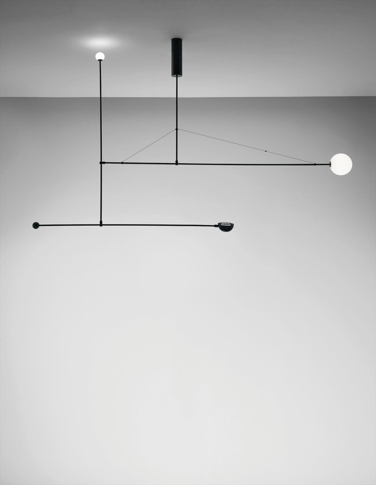 Patinated brass, painted tubular brass, hand-blown glass, metal wire.