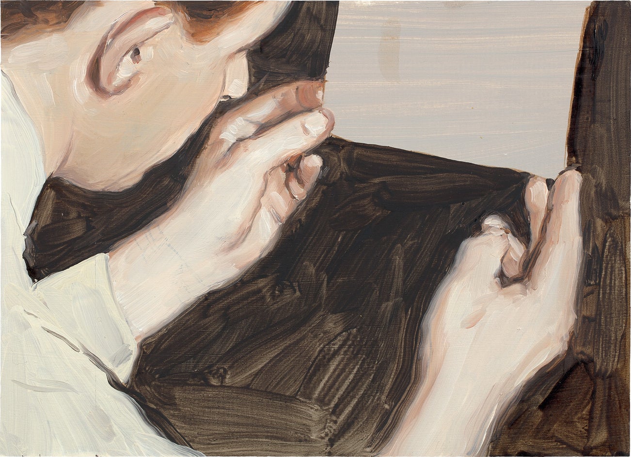 In the present work, the central unknown figure stares intensely at a sheet of paper, completely engrossed in the object in front of him. Submerging us into Borremans’ painterly microcosm, the figure holds the piece of paper up by its bottom corners at the furthest possible points, intent on displaying the whole object to the viewer; the figure delicately balances the right corner on the tips of his fingers, creating a sense of tension and intrigue. Peering over his right shoulder, the viewer is confronted with an unnervingly blank page. There are no clues elsewhere in the painting to help elucidate this enigmatic scene. There is neither a sense of time nor space in The Gap and it is this dislocated ambiguity, which imbues an element of cinematic poetry and mystery.