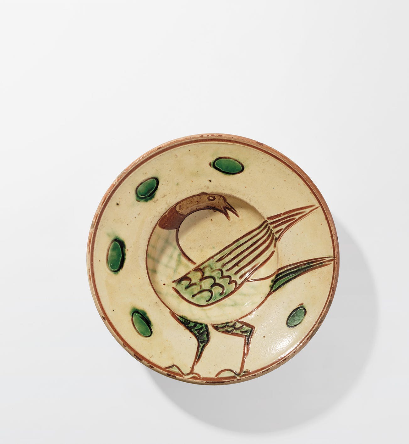 Earthenware, painted and incised slips and glazes.