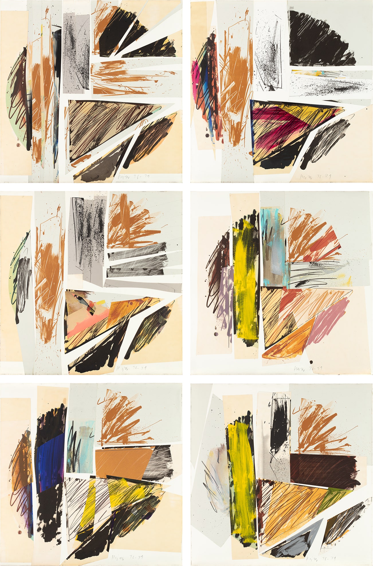 Six unique collages of cut and torn lithographs, screenprints and monotypes in colors, on Rives BFK paper mounted to rag board (as issued), the full sheets.