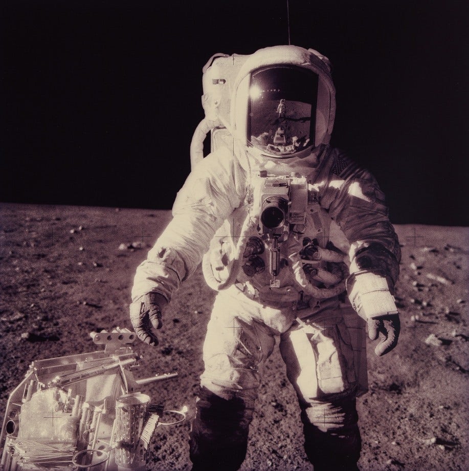 Alan Bean at Sharp Crater with the Hand Tool Carrier; Photographed by Charles Conrad, Apollo 12, November 14-24, 1969, from the project Full Moon