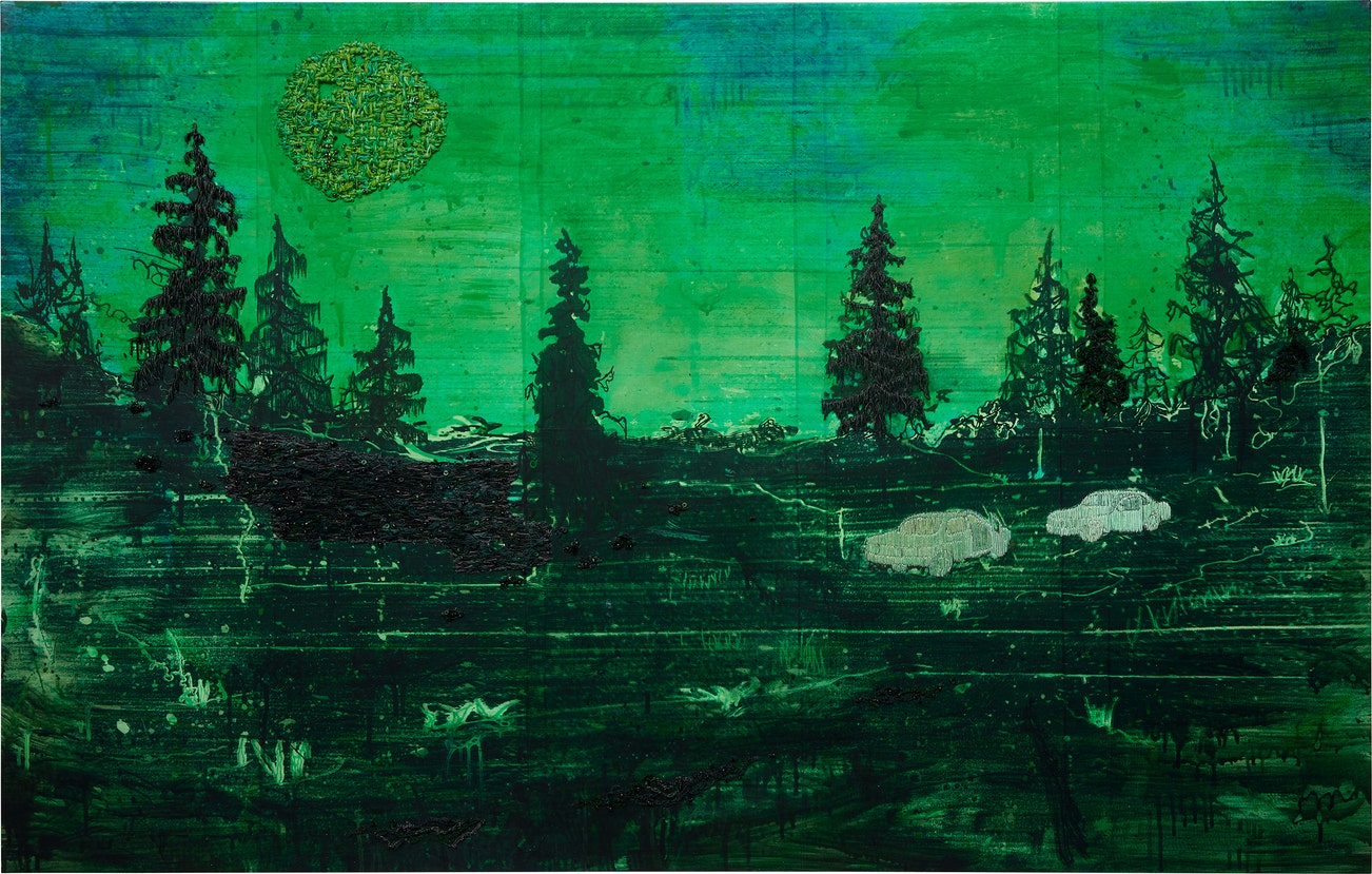 laser printer pigment transfer, dispersion, acrylic, beads and thread on canvas