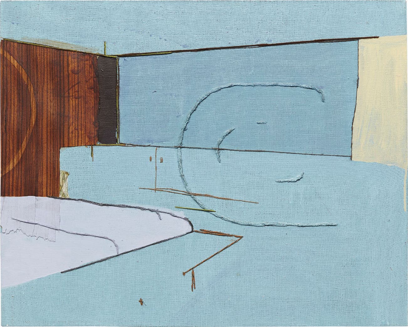 oil, acrylic, wood veneer, yarn on canvas