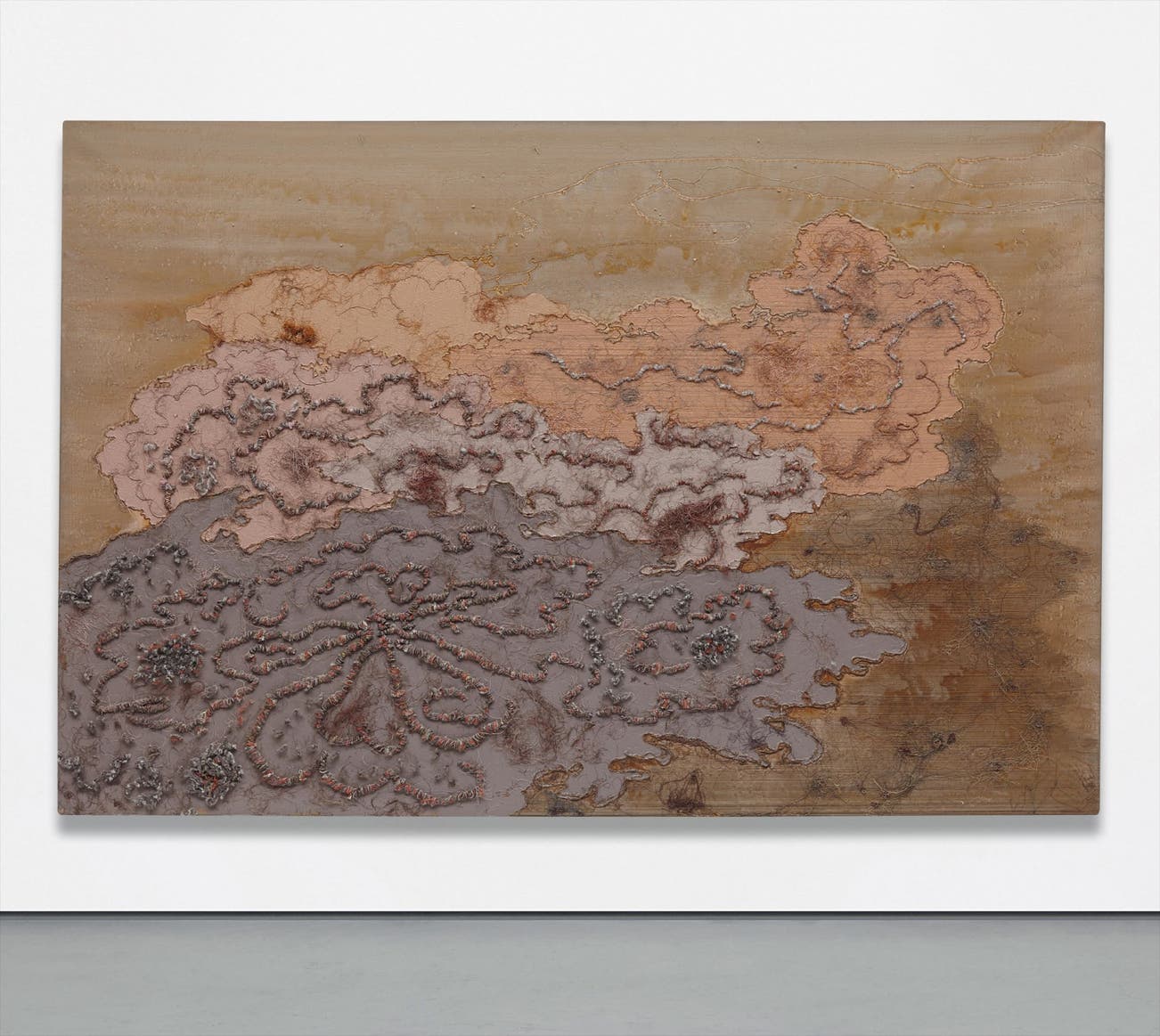 Signed, titled, dated and inscribed " - Michael Raedecker - 2001 - 60" x 90" - (153 x 229 cm) - 'Matter' - acrylic & thread on canvas - Berge A7 hand primed linen - " along the overlap.