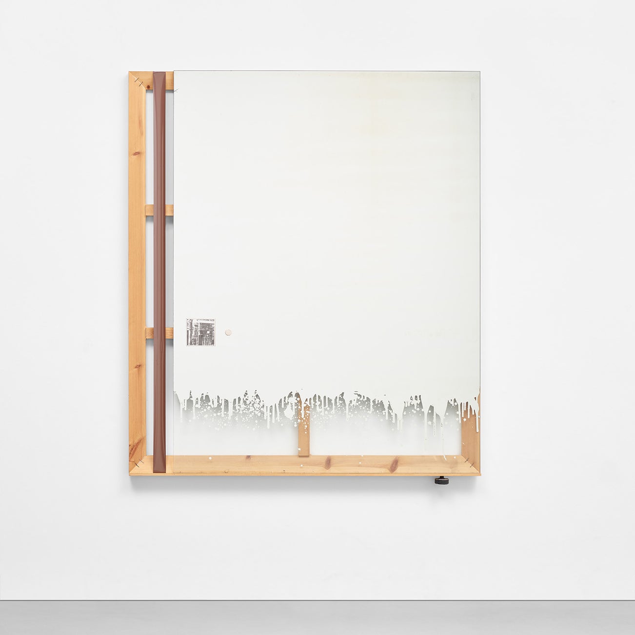 etched mirror, wood, two-inch tape, painted badge, card, cellophane, technics foot and image from Guy Debord's Panegyric showing 'NE TRAVAILLEZ JAMAIS' graffiti