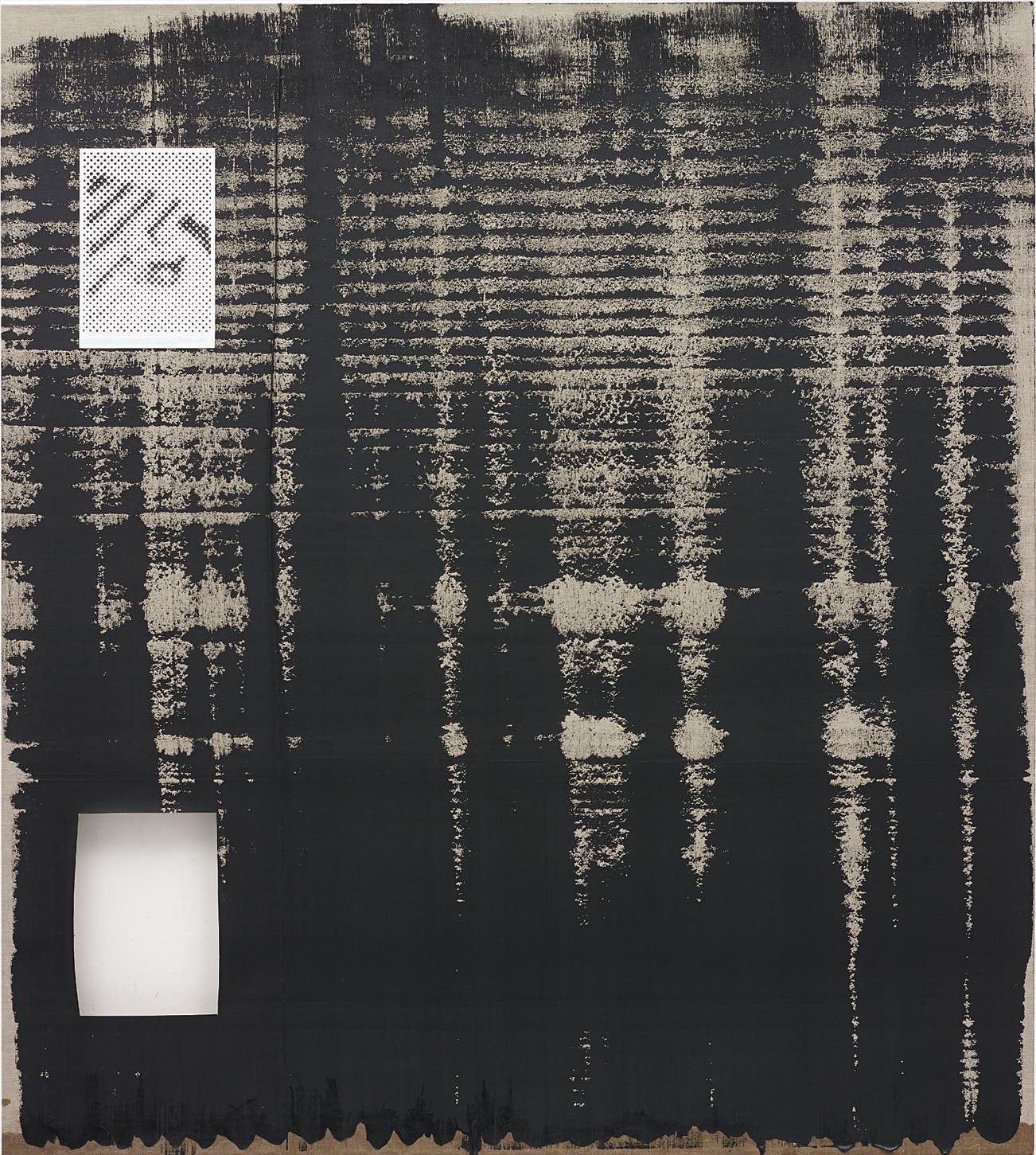 acrylic on linen with verdigris, oil, beeswax, painted badge, blackboard paint, string and digital print