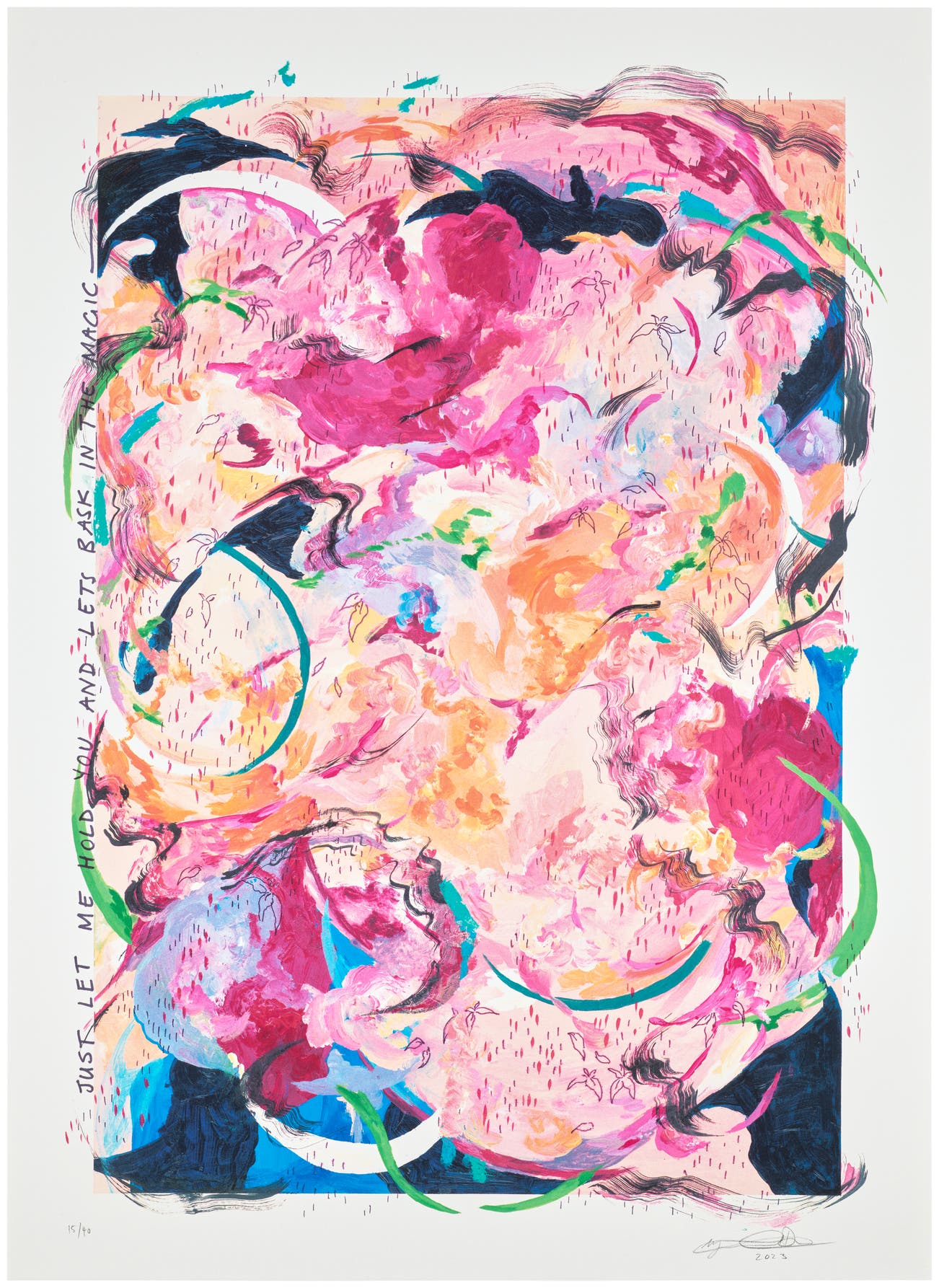 Screenprint in colors with high gloss varnish, on Somerset paper, with full margins.