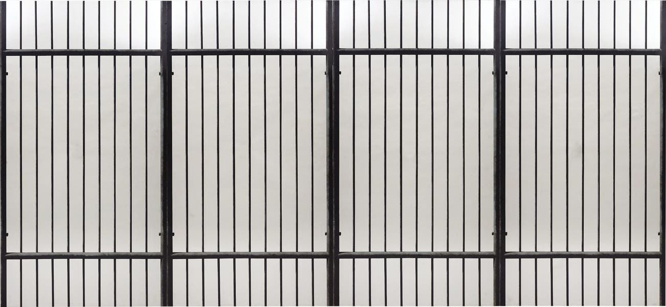 Between 1962 and 1974, Pistoletto produced 29 panels, each comprised of a cage section. Viewed as a unified whole the works produce the effect of trapping the viewer inside. Read individually or as in this case a group of four, the work succeeds in creating a profoundly disconcerting environment. La Gabbia, while maintaining a very slick and abstract dimension, is a highly political work with a philosophical line of enquiry. In a minimal and subtle manner Pistoletto questions the human psyche and the foundations of our freedom. Oscillating between abstraction and figuration, architecture and decoration La Gabbia opens up multiple layers of spatial perception. Similar to the creative output of Daniel Buren, Pistoletto’s bars reflect the space in which they are installed. The stripe, like the bar, is an archetypal element which is immediate and direct. Furthermore, like Jasper Johns Flags and Targets the viewer is immediately aware of the universal imagery and the connotations the cage provides.