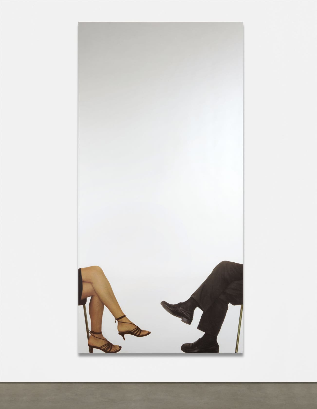 But it was Pistoletto’s works from the Mirror Paintings series that first distinguished the artist. To this day, they are perhaps his most iconic pieces. Gambe - Uomo e Donna, 2007, is a clear continuation of this series in which Pistoletto places a nearly photographic, life-sized painted image over a reflective steel plate. As a result, the viewer before the work is reflected by the work or, rather, incorporated into the work’s imaginary world. Thus open to perpetual change, these mirror paintings have recently been posited by eminent curator Carlos Basualdo as forerunners of key contemporary art trends, such as relational aesthetics and interactive art. At the same time, these mirror pieces completely literalize the perspectival effects that masters of the Italian Renaissance had mathematically constructed and perfected for hundreds of years. Gambe - Uomo e Donna, 2007, therefore points to both the past and the future of art, while incorporating the present through its play with its immediate surroundings. To the artist, the mirror pieces also have an important relationship to one of the most significant moments of his career: his Arte Povera years. “Arte Povera,” Pistoletto explicates, “is…to present the simple material of life and to show how this material reacts in itself. In my mirror paintings, for example, I don’t produce any effect, any sign or any form that is personal, or is a personal affirmation. There is no affirmation in the mirror paintings, they are just phenomenological works in which time shows itself.” (Michelangelo Pistoletto in, interview with Julian Stallabrass, Tate, no. 25 Summer 2001, pp. 42-9).