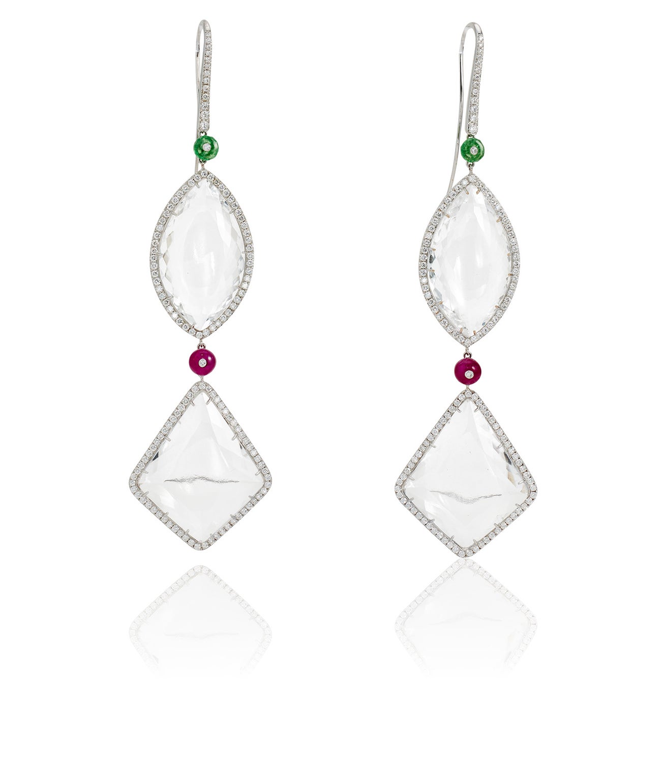 Pair of Rock Crystal, Diamond, Emerald, Ruby, and White Gold Earrings