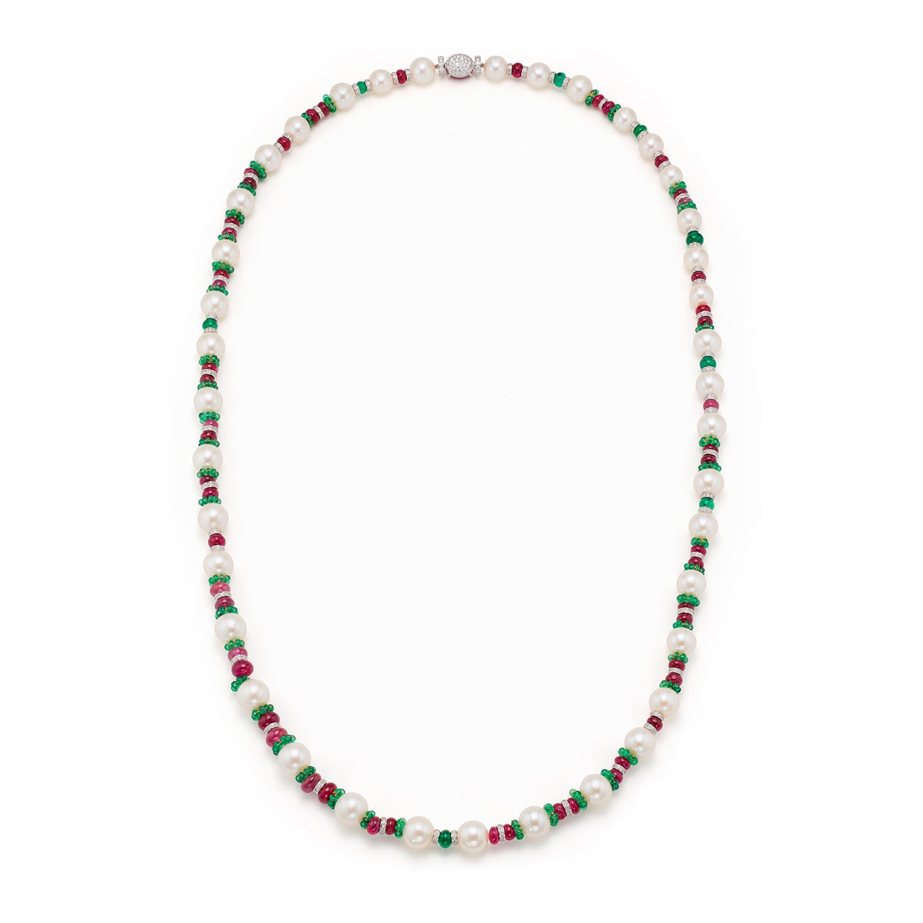 A Cultured Pearl, Emerald, Ruby, Diamond, and White Gold Necklace