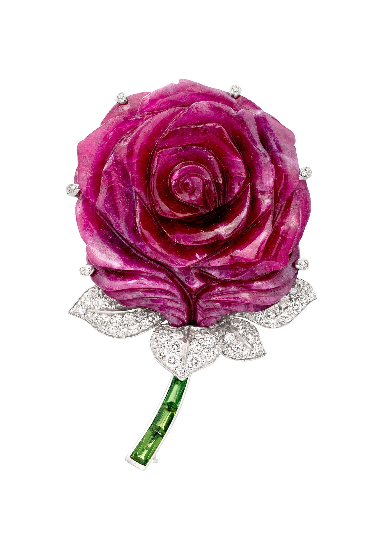 Designed as a rose, set with a carved ruby flowerhead stated to weigh 262.32 carats, highlighted with brilliant-cut diamond leaves, supported by a calibré-cut tourmaline stem, mounted in white gold, signed Michele della Valle, numbered, maker’s mark, length and width approximately 64.4 and 40.0 mm respectively, pouch stamped Michele della Valle.