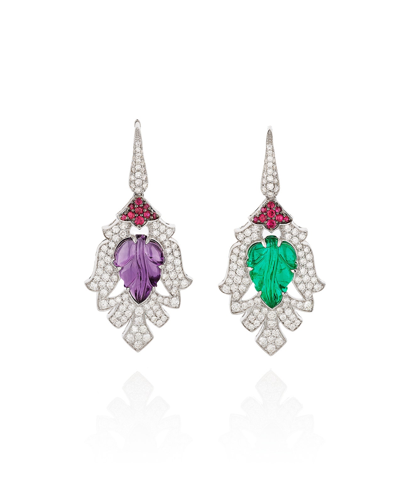 Of foliate design, each set with a carved cabochon emerald and amethyst, highlighted with circular-cut rubies and brilliant-cut diamonds, measuring approximately 48 x 24mm, signed Michele della Valle, numbered, pouch stamped Michele della Valle.