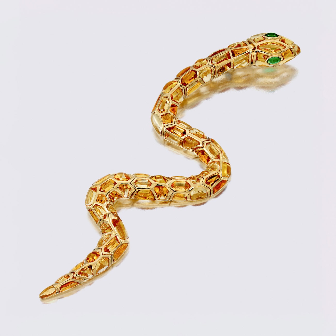 Designed as an articulated snake, set with buff-top citrines, decorated with marquise-shaped cabochon emerald eyes, mounted in 18K gold, length approximately 5 1/2 inches, signed Michele Della Valle, numbered, with maker's mark.