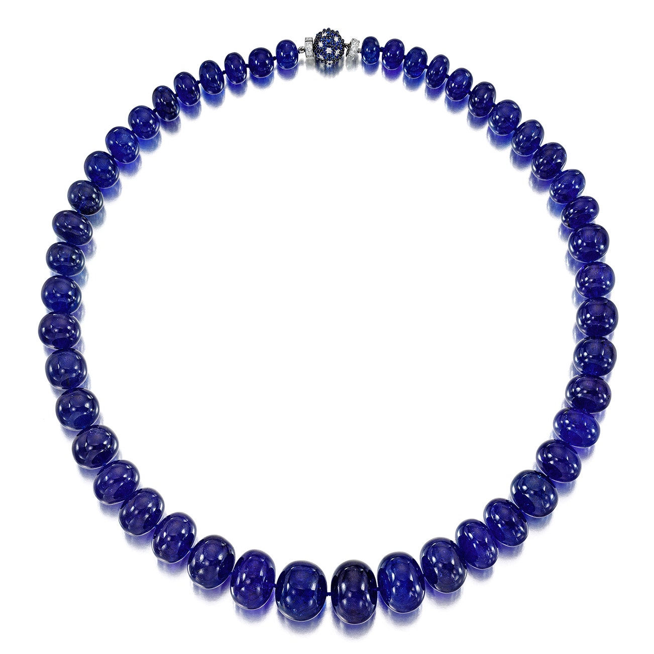 Composed of a single strand of graduated tanzanite beads, the clasp embellished with sapphire cabochons, accented by square and brilliant-cut diamonds, mounted in 18k white gold, length approximately 23 inches, signed Michele della Valle, numbered.