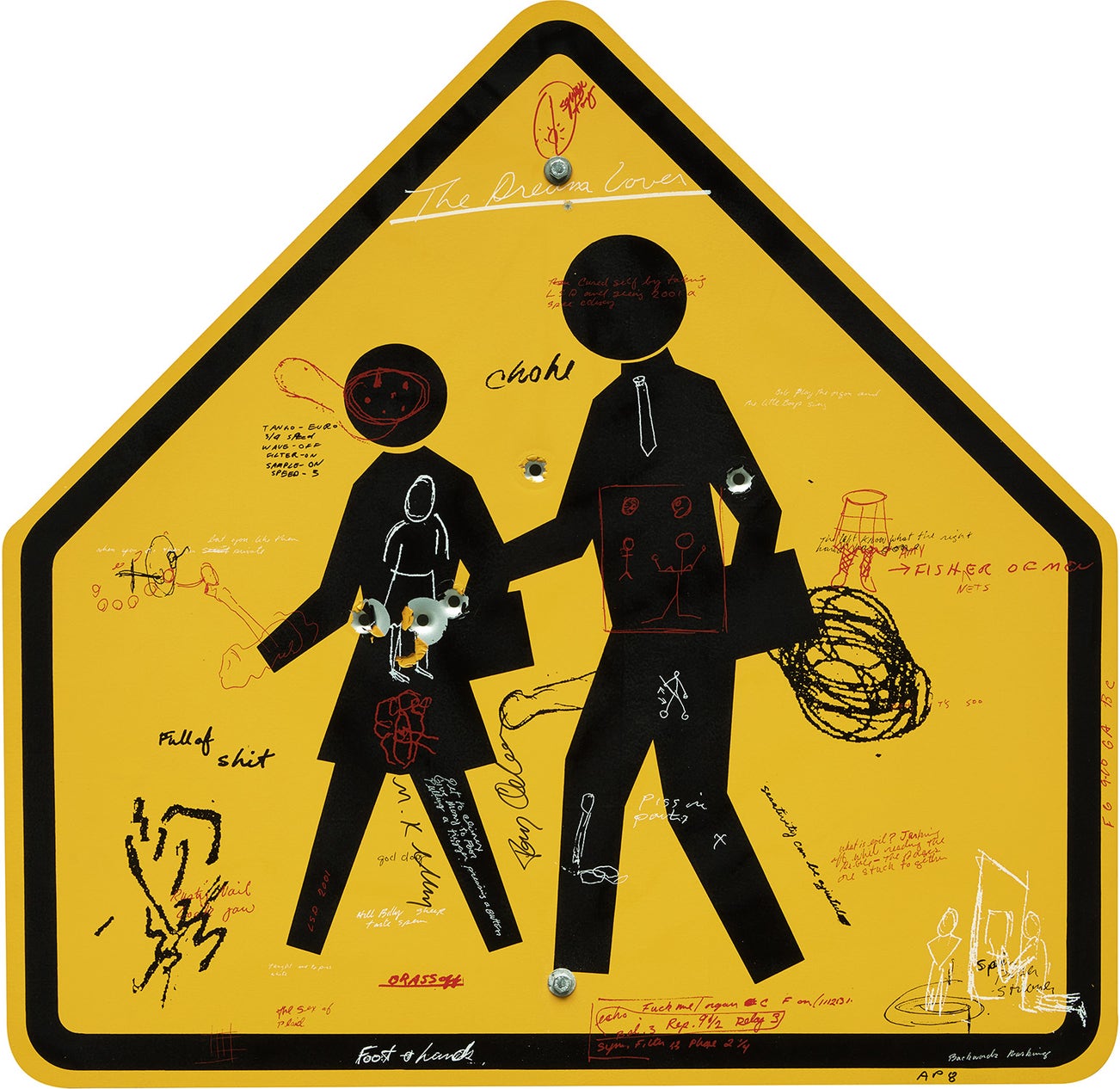 Screenprint in colors, on aluminum with bullet holes.