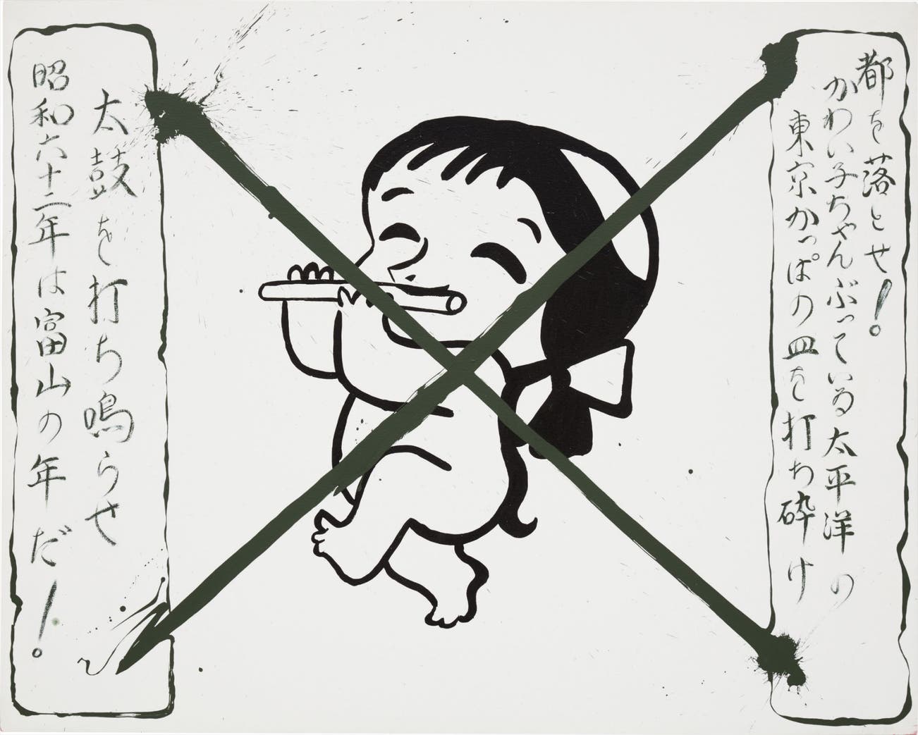 Mike Kelley’s Feudal War from 1987 portrays the Japanese folkloric Kappa (river-child), a mischievous water deity traditionally depicted as a child-sized humanoid in legends. The Kappa character lies between the "crossfire" of intensely profane slangs between Toyama and Tokyo, two feuding Japanese cities. At the time the present lot was created, Kelley had completed a series of work which dealt with themes from Japanese culture and history, including the 1986 film Kappa which he collaborated with Bruce Nauman and Norman Yonemoto. The work’s imagery derives from legendary Kappa portrayals seen throughout Japan. As troublemakers, their pranks range from the relatively innocent to the more menacing kidnapping of children, feeding on the blood of their victims. Even today, signs warning children against the presence of Kappa are seen in some Japanese towns and villages.