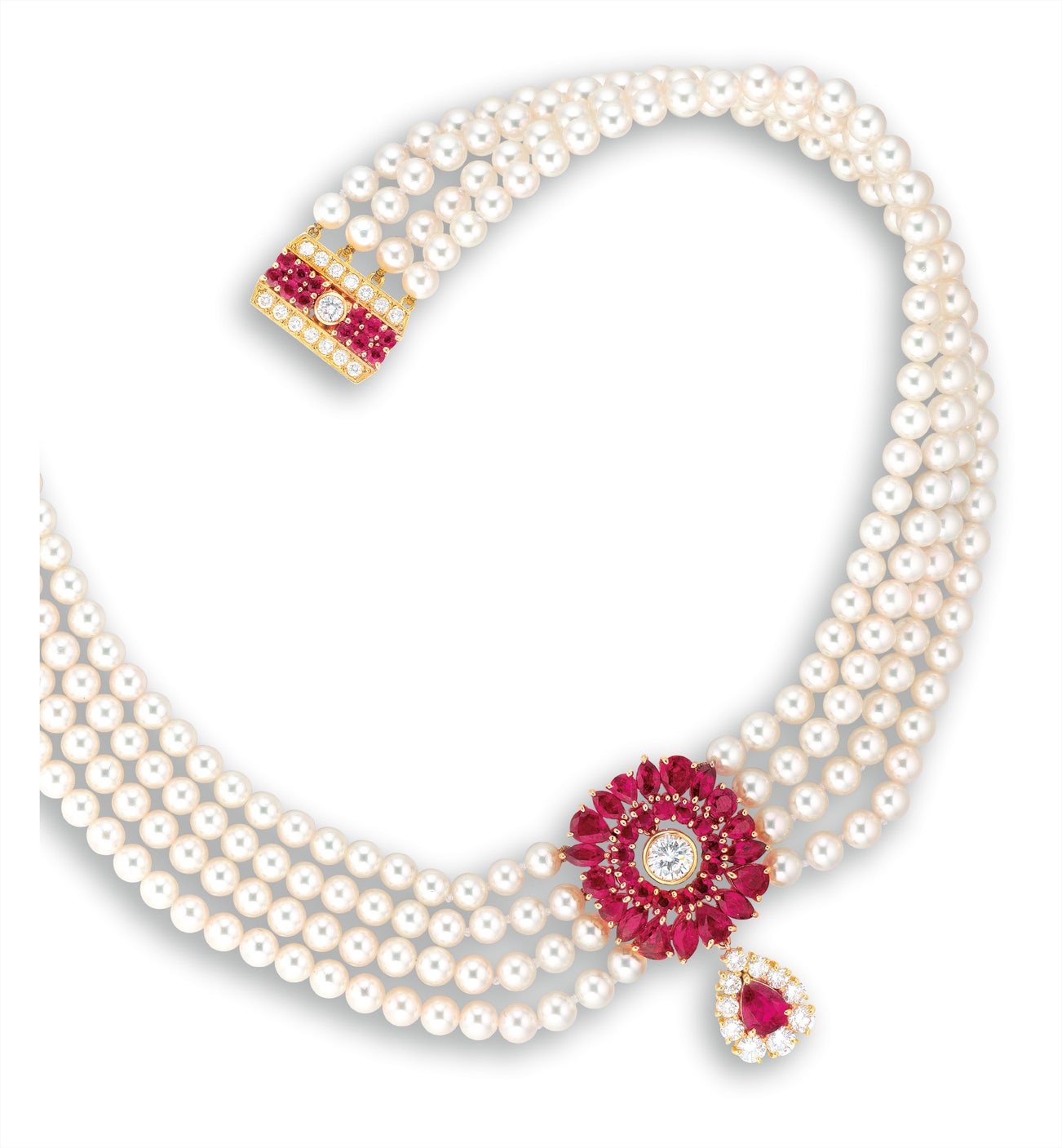 A Cultured Pearl, Ruby and Diamond Necklace, Mikimoto
