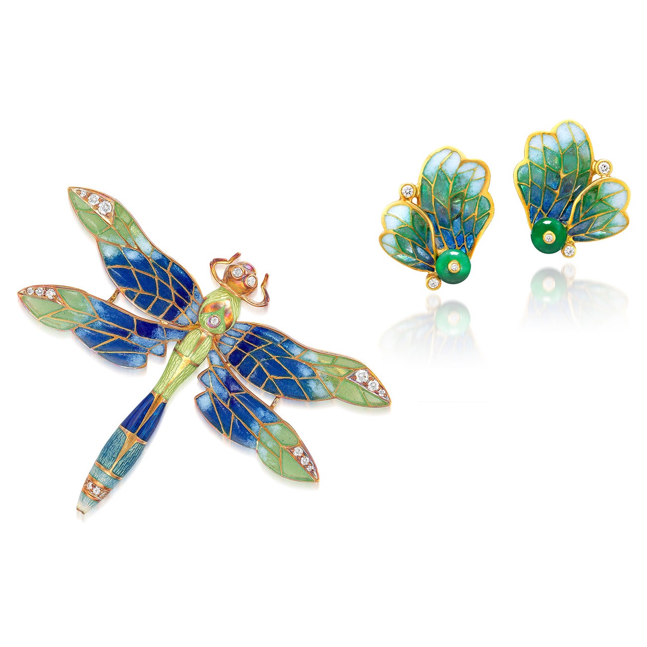 A Set of Enamel, Diamond and Chalcedony 'Dragonfly' and 'Butterfly' Brooch and Earrings