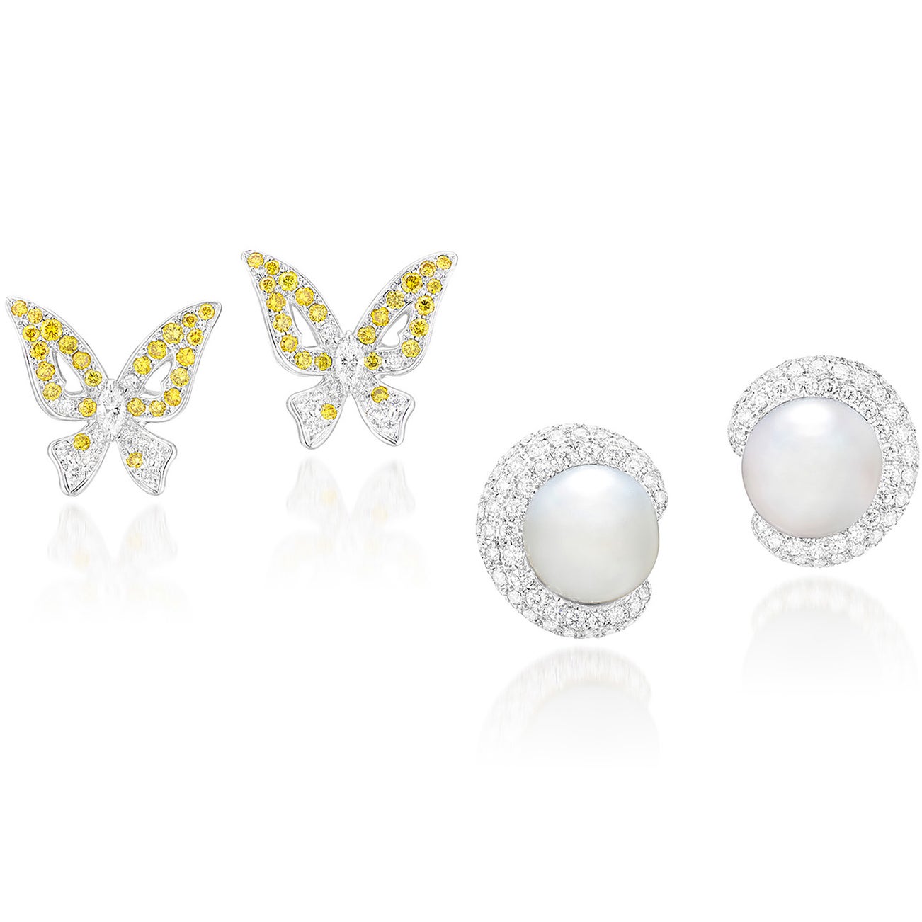 Two Pairs of Cultured Pearl, Coloured Sapphire and Diamond Earrings